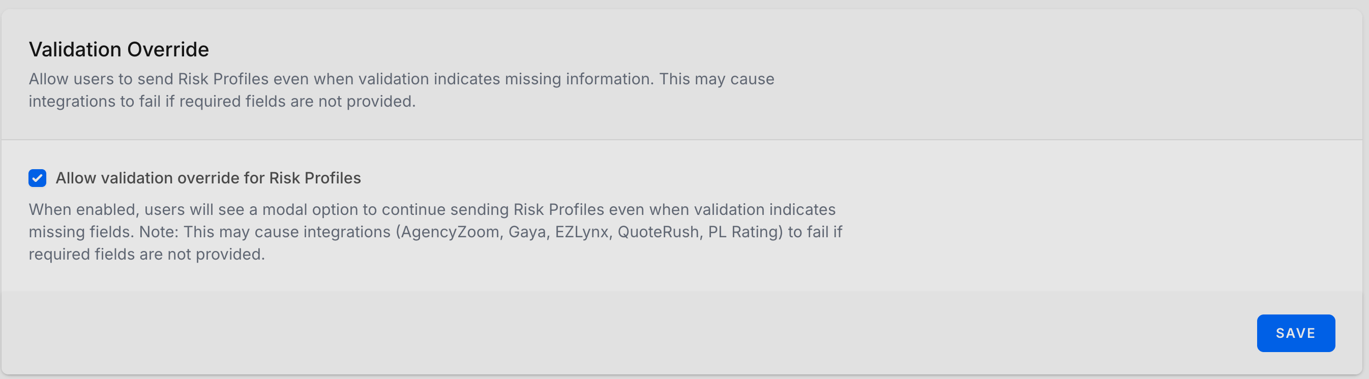 Weβve added the option for an agency to decide if the required information can be bypassed by their users. Enabling Validation Override allows the agent to move forward even when certain fields are missing or invalid.